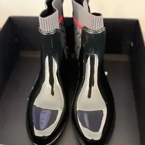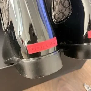 Shiny black patent Chelsea boot with elastic ribbed collar. Signature Coach monogram panel at the ankle. Contrasting red stripe detail. Heel pull tab for easy wear. Polished, streamlined profile.