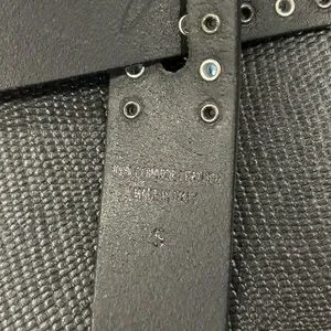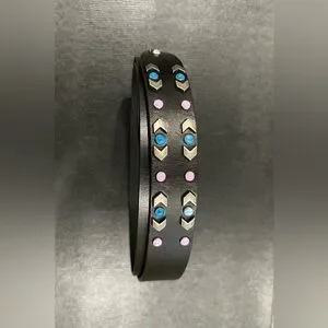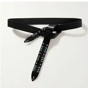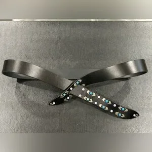 Black leather belt by Isabel Marant. Features blue and pink stud accents. Sleek and modern design. Adjustable fit. Stylish statement accessory. Last pic is just an idea of how to accessorize a dress.