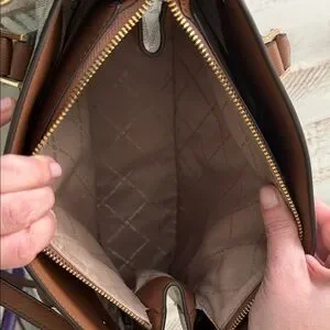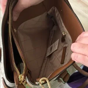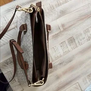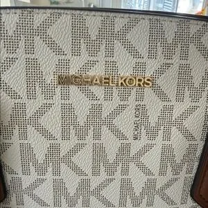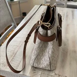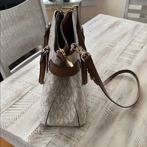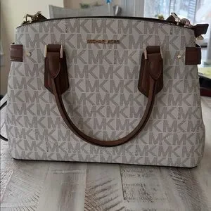 Michael Kors satchel in cream signature logo canvas. Brown leather handles and trim with matching crossbody strap. Gold-tone hardware accents. Structured silhouette for everyday use. Approx 42 inch strap.
