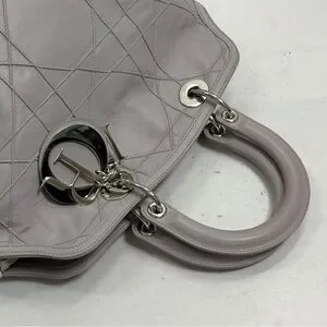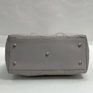 This Dior satchel in a sophisticated gray hue features a structured, boxy design with a luxurious quilted pattern. Crafted from high-quality materials, it boasts sturdy top handles for comfortable carrying. The bag's elegant finish and timeless style make it a perfect accessory for any occasion. Approximately 12.9" x 11.8"