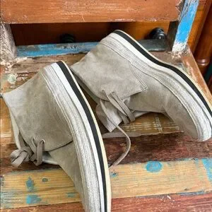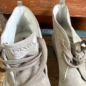 Prada chukka boots in soft taupe suede. Lace-up front with subtle branding on the tongue. Cushioned leather-lined interior for comfort. Clean, versatile silhouette for casual and smart looks.