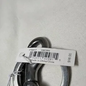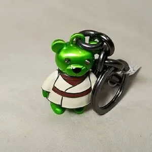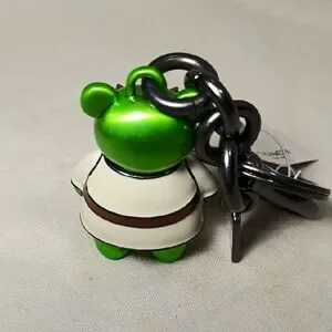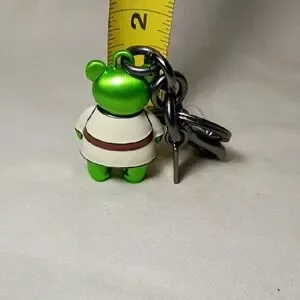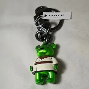 Green metallic bear charm by Coach. White enamel outfit with brown trim. Gunmetal keyring and chain. Charming accessory for bags or keys.