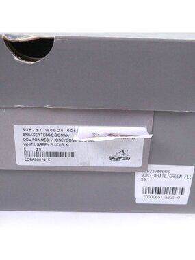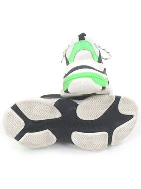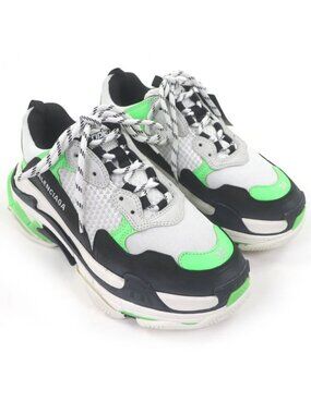 This is an authentic pair of Balenciaga Triple S sneakers. These distressed "dad shoe" style sneakers feature a white mesh and leather upper with neon green and black accents, along with a chunky, textured rubber sole.