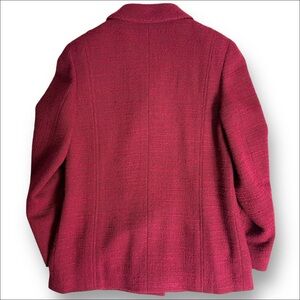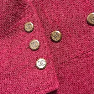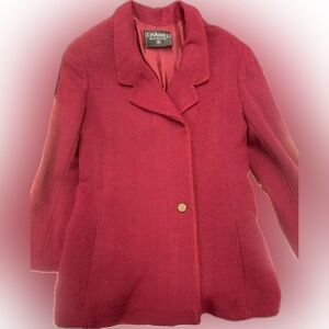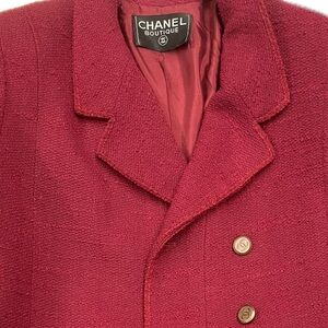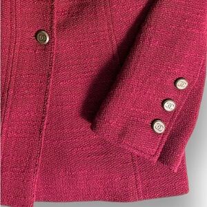 Chanel blazer in vibrant burgundy tweed. Features side pockets and signature buttons for a luxurious touch. Perfect for the upcoming holiday season. Has shoulder pads and cc logo lining. A piece of history and luxury.