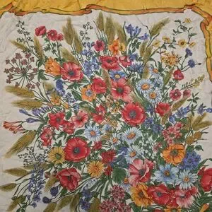 The product is a vintage Gucci 100% silk scarf made in Italy, with a floral bouquet design. This luxurious accessory is perfect for women who appreciate high-quality materials and timeless style. The scarf's intricate floral pattern adds a touch of elegance to any outfit, making it a versatile and chic addition to any wardrobe. Made with pure silk, this Gucci scarf is a true representation of luxury and sophistication.