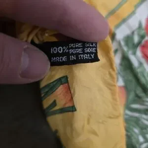 Based on research appears to be a Gucci scarf with hand rolled hem. Authentic Gucci silk scarves typically feature hand-rolled and hand-stitched edges. The stitching should be neat, with small, internal stitches that create a non-flat, cylindrical edge, even if not perfectly uniform due to being handmade. Please see pictures to verify. Also is 100% Silk made in Italy as details say verify authenticity.