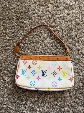 Louis Vuitton mini pochette in white multicolor monogram canvas. Tan leather trim and gold-tone hardware. Compact shoulder style with vibrant multicolor logos. Playful and chic accessory for day or evening.