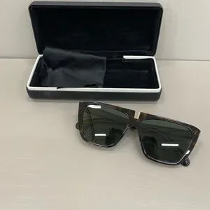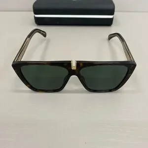Bold oversized square frames. Tortoiseshell acetate finish. Dark green tinted lenses. Comes with black hard case and cloth. Sleek and fashionable style. Smoke free home. No scratches.