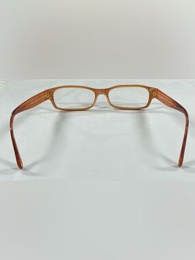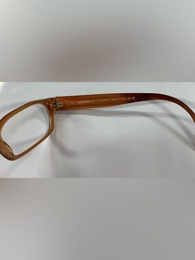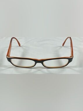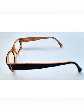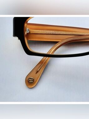 Classic rectangular CHANEL eyeglass frame. Black front with warm amber temples. Subtle designer logo accents on the temple tips. Sleek and versatile silhouette.