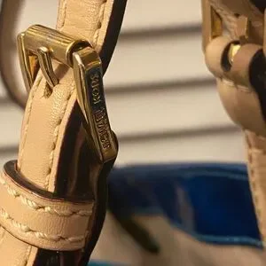 Hardware: Polished gold-tone accents including grommets and adjustable buckle straps
