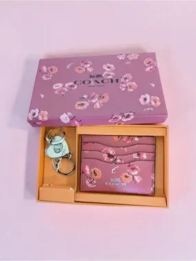 Coach Boxed Card Case and Valet Keyring Gift Set in Floral Poppy NIB