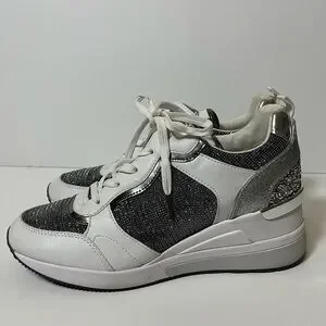Michael Kors Crista Silver White Mixed Media Wedge Sneakers Trainers Glitter Women’s Size 9.5