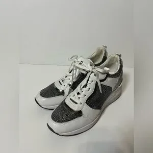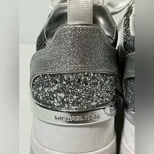 Michael Kors Crista Silver White Mixed Media Wedge Sneakers Glitter Women’s 9.5