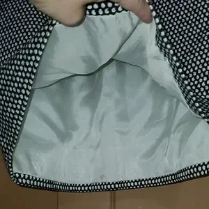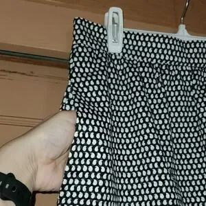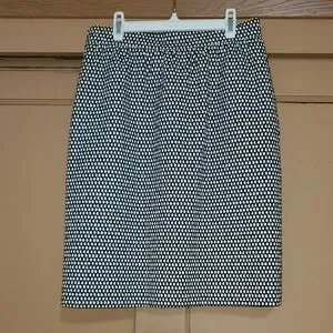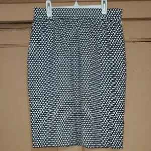 Tailored pencil silhouette with a classic polka dot pattern. Elasticized waistband for comfortable wear. Sleek, versatile design for office or events.