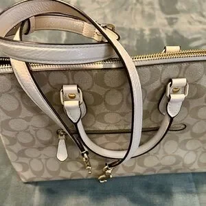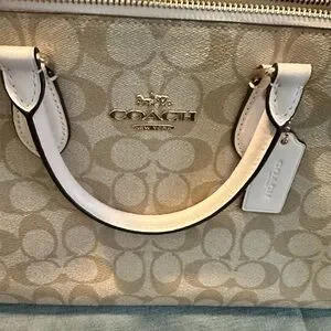 NWT Authentic Coach satchel in signature khaki canvas. Chalk leather trim and handles. Gold-tone Coach logo hardware. Structured, everyday design. 13 L x 8.5 H Shoulder strap included. Smoke free home.