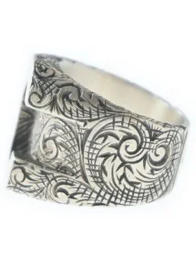 This is an authentic Gucci ring in silver. The ornate design features intricate scrollwork and a prominent horseshoe-shaped emblem in the center, showcasing Gucci's iconic styling.