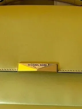 Compact Michael Kors crossbody in sunny yellow leather. Gold-tone chain and hardware. Flap front with logo plaque. Adjustable chain-shoulder strap. Polished, structured silhouette for day-to-night wear.