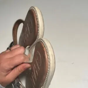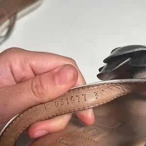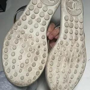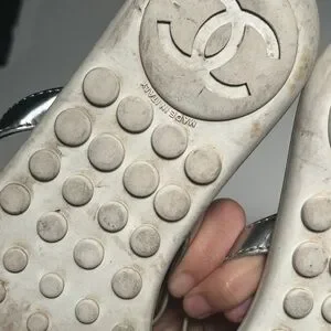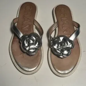 Chic CHANEL sandals with metallic silver floral accents. Ideal for adding elegance to any outfit.