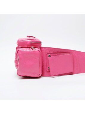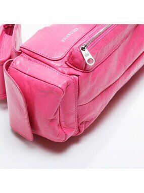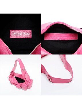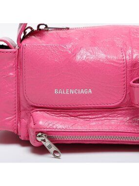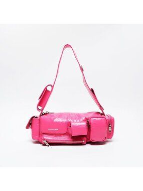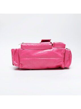 This is an authentic Balenciaga Shoulder Bag S Ring XS in a vibrant pink color. The bag features a sleek silhouette with multiple zippered compartments and a shoulder strap, showcasing the brand's signature hardware and premium craftsmanship.