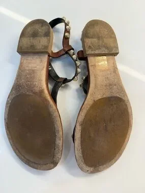 Brown leather T-strap sandals with decorative gold-tone studs. Adjustable ankle strap for a secure fit. Cushioned black footbed for everyday comfort. Versatile design pairs well with casual and dressy looks.