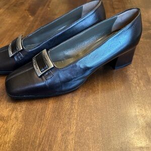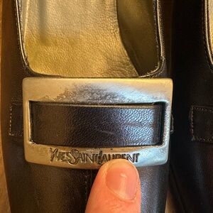 Note: Buckle on both shoes show discoloration and some scratching. Soles show wear. Interior has some discoloration. Please see pics for condition. Color is not black rather a brown with a shine.