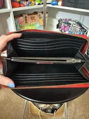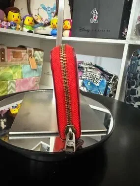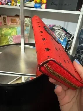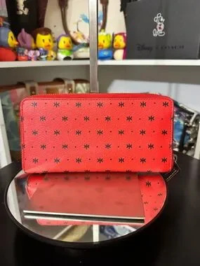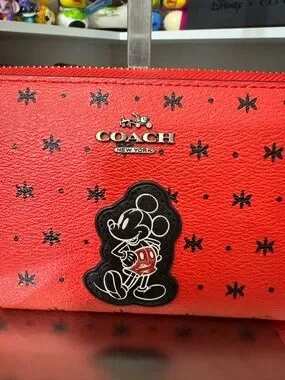 Coach zip wallet in vibrant red leather featuring a playful black Mickey patch and star print. Gold-tone Coach logo on front. Zip-around style for secure storage. Stylish and fun accessory for everyday use.