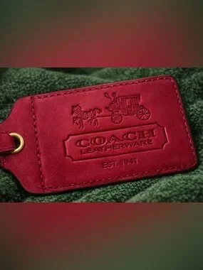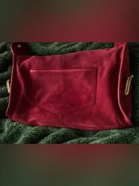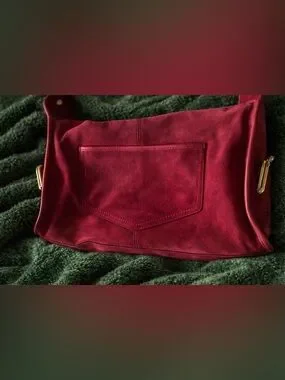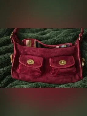 Elegant deep burgundy suede shoulder bag with gold-tone hardware. Features two front flap pockets with secure turn-lock closures. Soft suede construction and adjustable shoulder strap for comfortable everyday wear. Stylish, versatile design that complements both casual and dressy outfits. 100% authentic Coach guaranteed