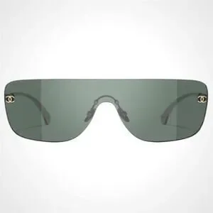 New CHANEL Sunglasses Gold Metal Rimless Shield Mask Green Lens CC Logo