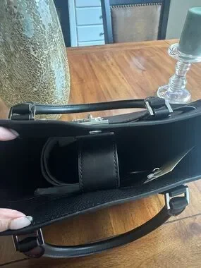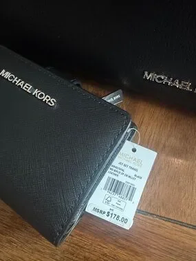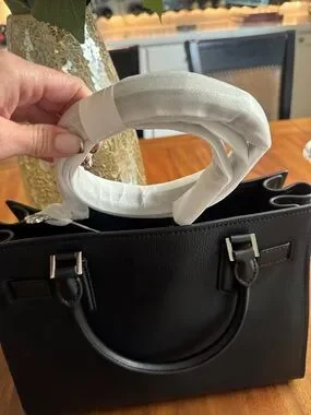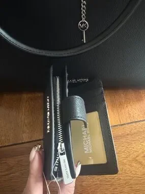 Classic Michael Kors leather satchel in sleek black. Silver-tone MK logo charm and hardware. Top handles and structured frame. Secure zip top for essentials. Timeless, versatile design for daily use. Brand new tags still on with matching wallet. Value $736
