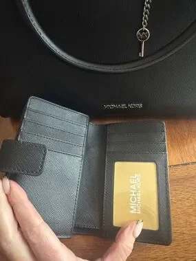 Michael Kors Black Leather Satchel Silver-Tone Charm and Matching Wallet New