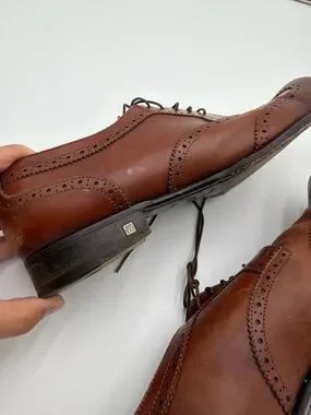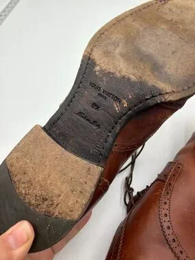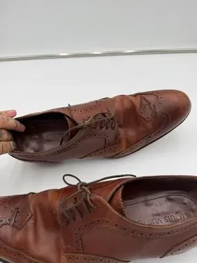 The product is a pair of Louis Vuitton men's dress shoes in size 9.5 with a classic brown leather brogue style. Made in Italy, these lace-up shoes showcase the luxury brand's signature elegance and craftsmanship. Perfect for formal occasions or adding a touch of sophistication to a dressy ensemble, these shoes are a stylish and high-quality choice for the modern gentleman. Please see all pictures for condition, they are still in tact and wearable. They do need a good cleaning and maybe some leather repair? Or wear as is!