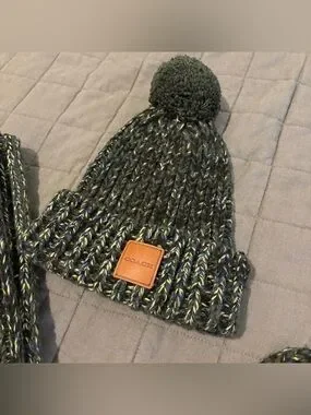 Coach Gray Scarf, Hat & Mittens Set. Gray with strands of black, white, and blue.