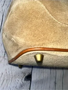 Exterior suede shows some darkening and discoloration and dirt on edges/corners