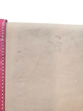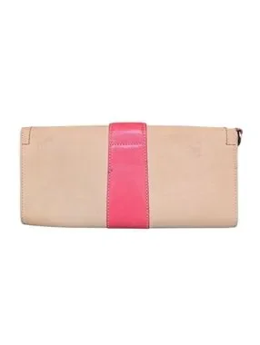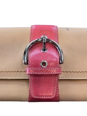 Coach Soho Vachetta Leather Clutch with a buckle flap design that was part of a limited edition collection from the early 2000s. Magnetic snap closure under the decorative buckle, interior slip pocket, and originally included a detachable wristlet strap and hang tag. Features natural tan vachetta leather with a pink leather buckle strap and silver-tone hardware. Gorgeous preloved vintage piece.