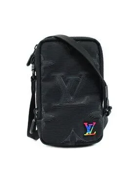 This is an authentic Louis Vuitton Double Phone Pouch Shoulder Bag in black. Crafted from durable nylon, this versatile bag features the iconic Louis Vuitton monogram pattern and a detachable shoulder strap for easy wear.