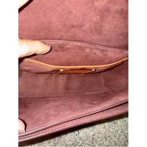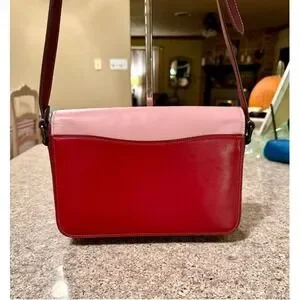 This pre-owned Coach crossbody bag features a two-tone leather design with a light pink flap and a deeper red/burgundy body, strap, and sides. It has a gunmetal-tone "C" logo turn-lock closure. The interior is lined with a suede-like material and includes a slip pocket, with "GENUINE GLOVETANNED LEATHER" embossed. Visible signs of wear include minor scuffs on the exterior leather bottom. Not noticeable when holding or wearing the bag. The adjustable strap allows for versatile wear.