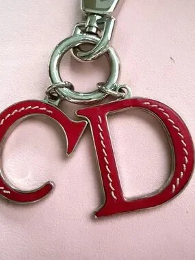 Dior metal and leather keychain charm with iconic CD logo. Bright red leather inlay with contrast silver hardware. Stylish accent for keys or bags. Elegant and recognizable brand detail.