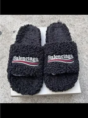 Designer slides with plush sherpa strap. Balenciaga logo embossed on the sole. Soft textured upper and durable rubber sole. Casual luxury for everyday wear.