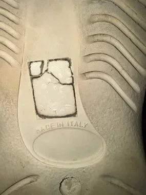 Iconic CC logo across the strap. Slip-on slide design. Neutral gray and cream colorway. Casual luxury style.