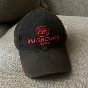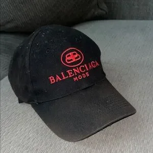 Designer Balenciaga baseball cap. Black cotton construction with red embroidered logo and 'MODE' text. Classic curved brim and adjustable back. Stylish everyday accessory.
