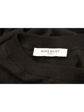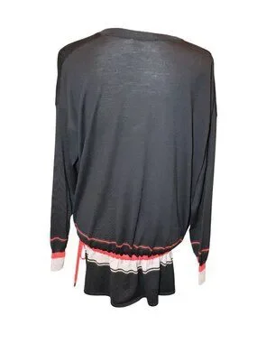 This Givenchy sweater, crafted from 100% wool, features a classic V-neck, long sleeves, and adjustable waist ties. The red and beige striped accents add a touch of sophistication to the black base. Made in Italy.