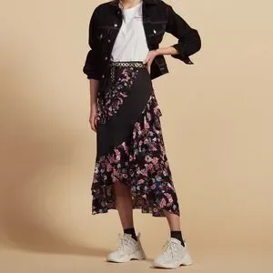 Sandro Paris black floral asymmetrical skirt with cascading ruffle detail.