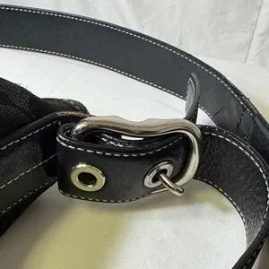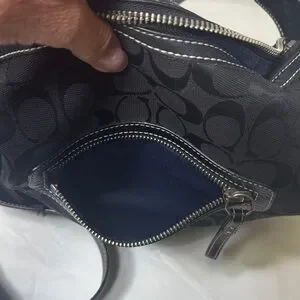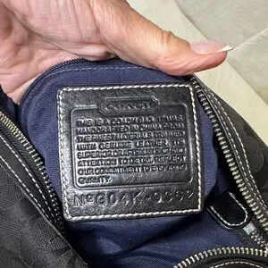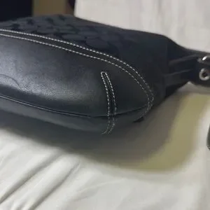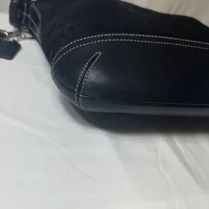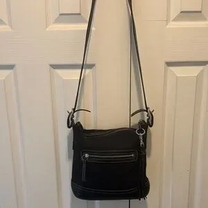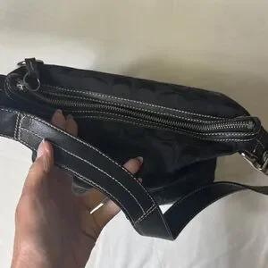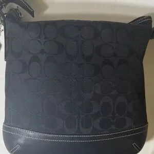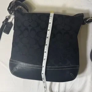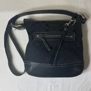 Classic Coach crossbody bag in black signature jacquard fabric with black leather trim and base. Features an adjustable strap, exterior zip pocket, top zip closure, and silver-tone hardware. Era 2004. Tassel and not original hangtag