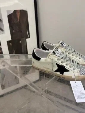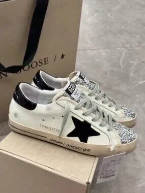 Golden Goose White Leather Sneakers with Black Star & Glitter Toe