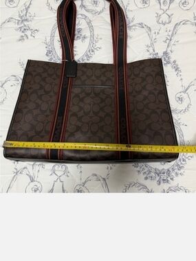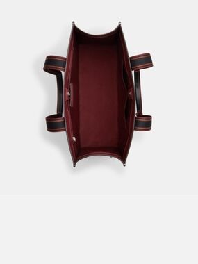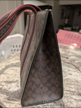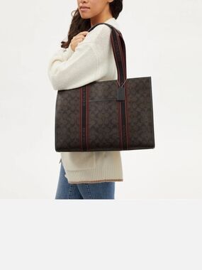 Coach signature canvas tote in brown with maroon-trim straps. Durable coated canvas with bold logo webbing straps. Spacious, everyday carry with a polished, versatile look.