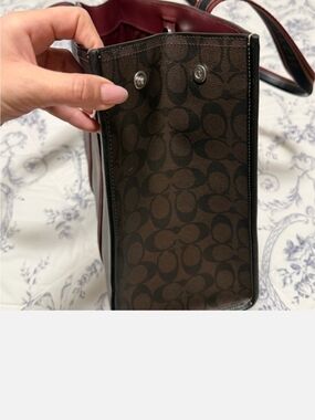 Coach Signature Canvas Large Tote in Brown with Maroon-Trim Straps