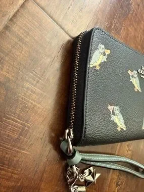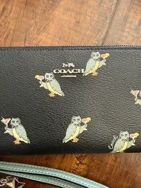 Coach Black Leather Wristlet Wallet with Party Owl Print
