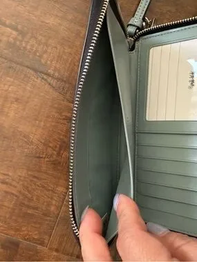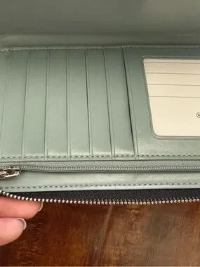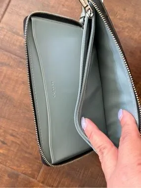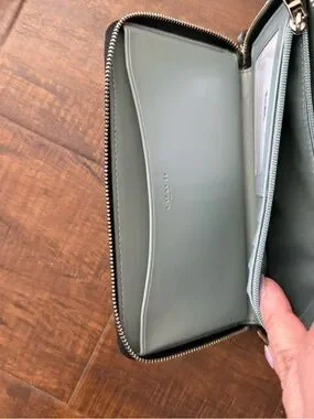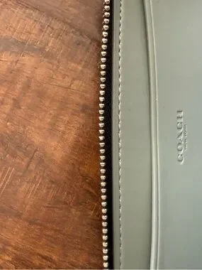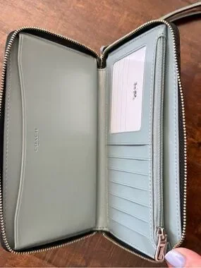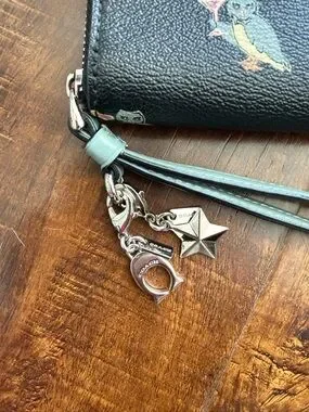 Coach zip-around wristlet wallet. Black pebbled leather with repeated owl holding cocktail print. Silver-tone Coach logo and zipper hardware. Includes detachable blue leather wrist strap with charm accents and silver hardware.