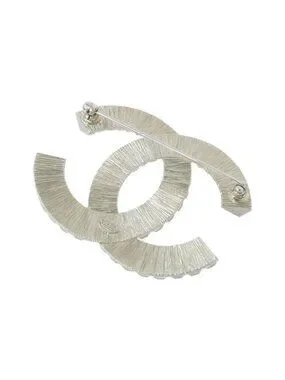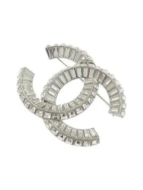 This is an authentic Chanel brooch in silver. The piece features a spiral design embellished with sparkling baguette-cut crystals that create a dynamic, eye-catching silhouette.