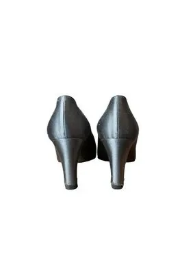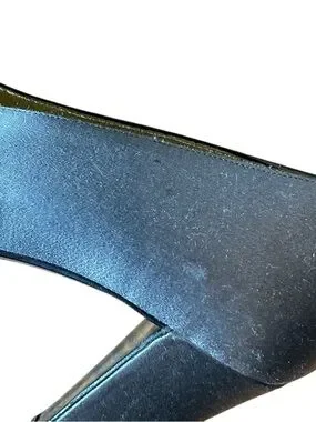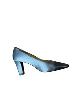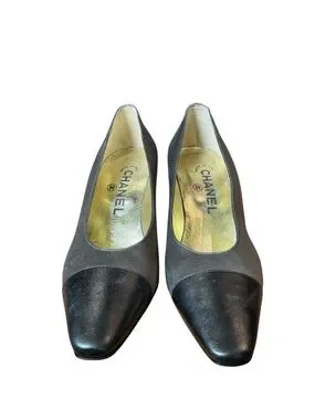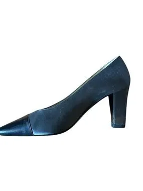 Vintage Chanel Satin Block Heel Leather Cap Toe Pumps